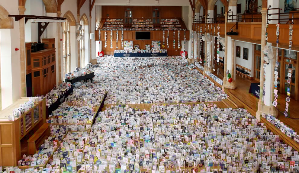 在貝德福德(Bedford),撐著助行器繞家中院子走了一百圈,替英國國民保健署(NHS)募得 2,860萬英鎊(折台幣約 10.6億元)的二戰老兵穆爾(Tom Moore),在 100歲生日這天收到了成千上萬的卡片,放滿貝德福德學校(Bedford School)的禮堂。