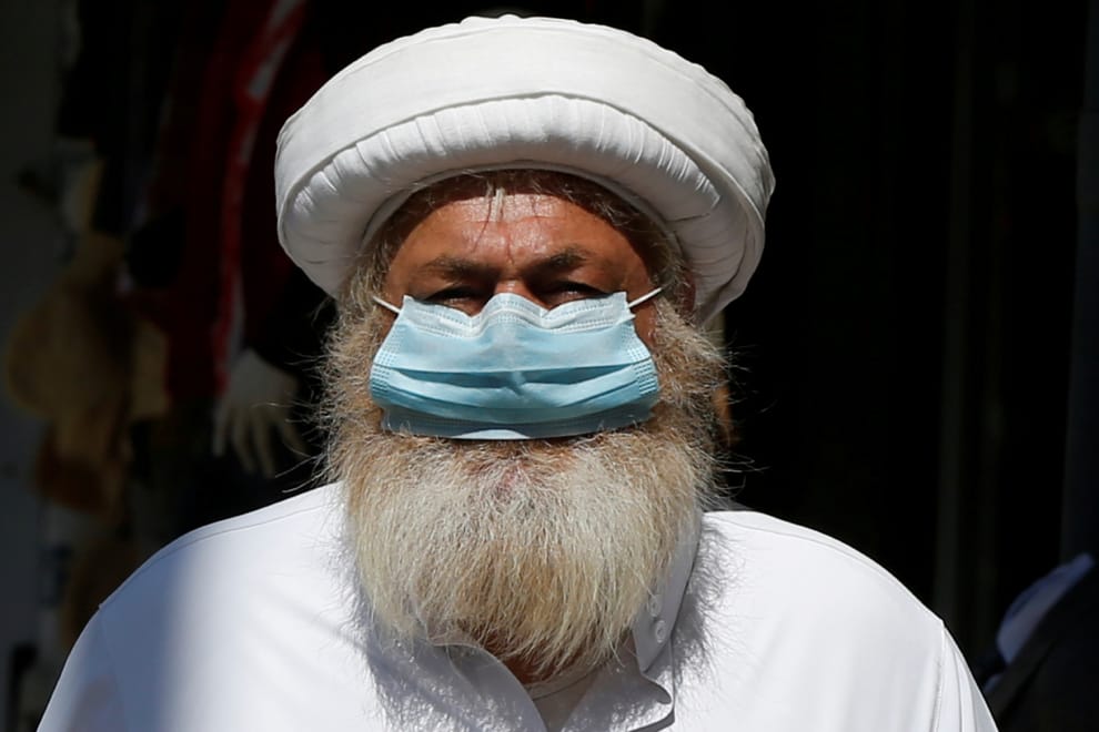 在安曼(Amman),雖然政府已經逐步放寬封鎖令管制,一名經過城中主要商業區的男子仍然選擇戴上口罩才出門。