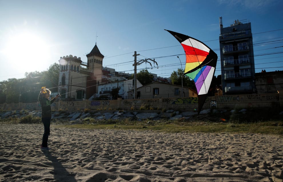 在巴塞隆納北部的埃爾馬斯諾(El Masnou),小男孩在海邊放風箏。