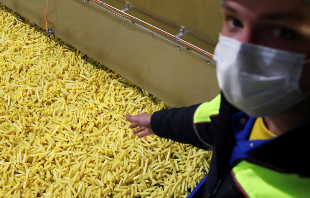 在穆斯克龍(Mouscron),專賣冷凍、脫水馬鈴薯產品的麥迪貝爾公司(Mydibel Group)員工在生產線上自拍,身後是大量的薯條。