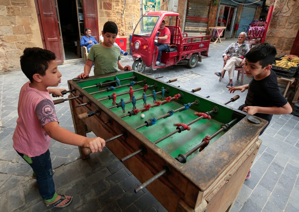 在賽達市(Sidon),於全國封鎖令期間,男孩們仍開心地玩著手足球。