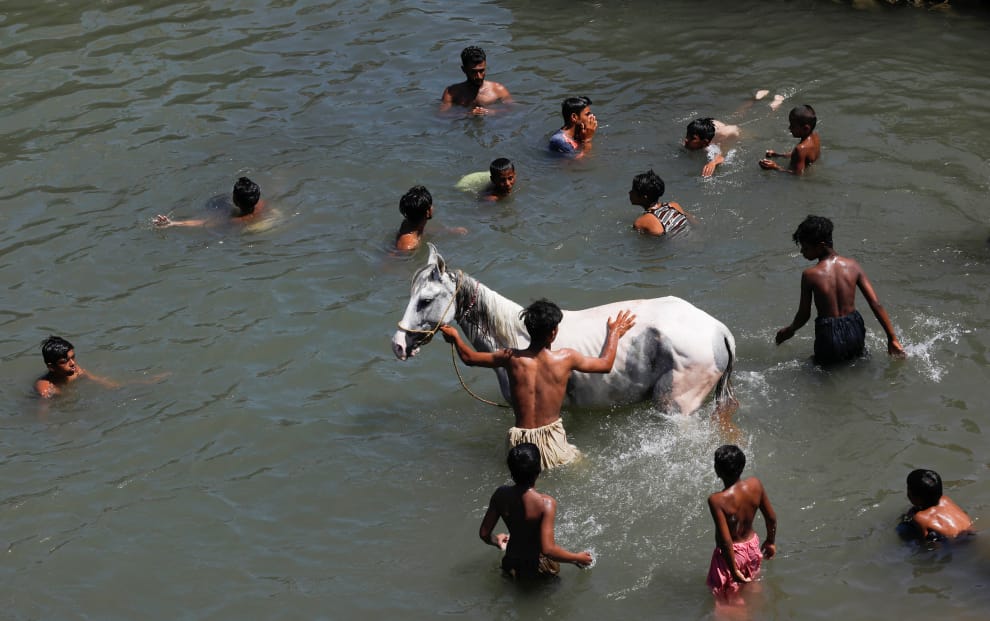 在喀拉蚩(Karachi),一名男子趁著齋戒月(Ramadan)期間,到阿拉伯海(Arabian Sea)幫他的白馬洗澡。