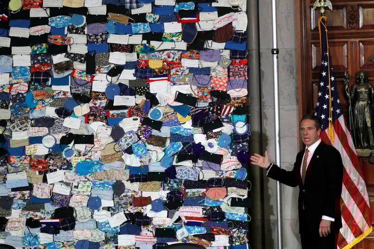 在紐約州議會大廈(State Capitol in Albany),州長古莫(Andrew Cuomo)展示一面由數百個全美各地的民眾寄給紐約州的口罩組成的藝術牆。