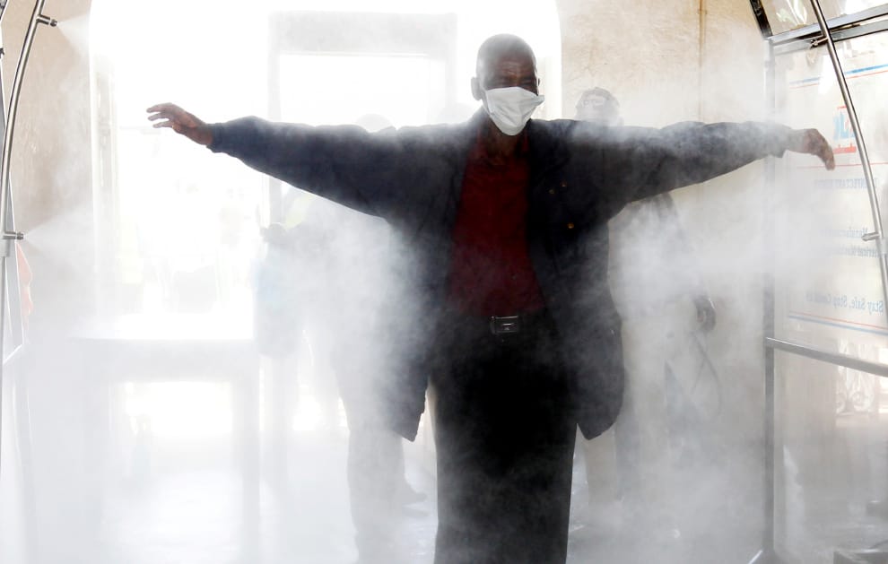 在奈洛比(Nairobi)的一處火車站內,一名乘客在搭乘肯亞鐵路公司(Kenya Railways Corporation)的火車前,走進一個消毒設施中進行消毒。