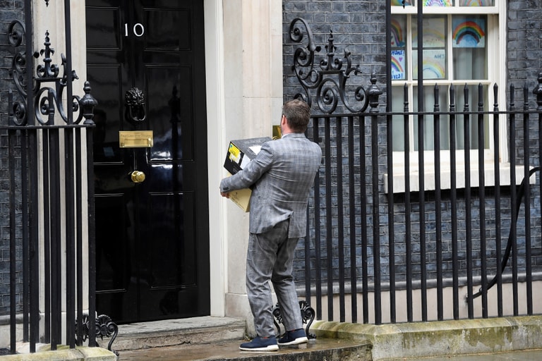 在倫敦(London),一名身穿西裝的男子抱著幾箱啤酒,站在英國首相官邸唐寧街 10號(10 Downing Street)外。周三(29),英國首相強森(Boris Johnson)的兒子在他病癒回歸政壇後不久誕生。