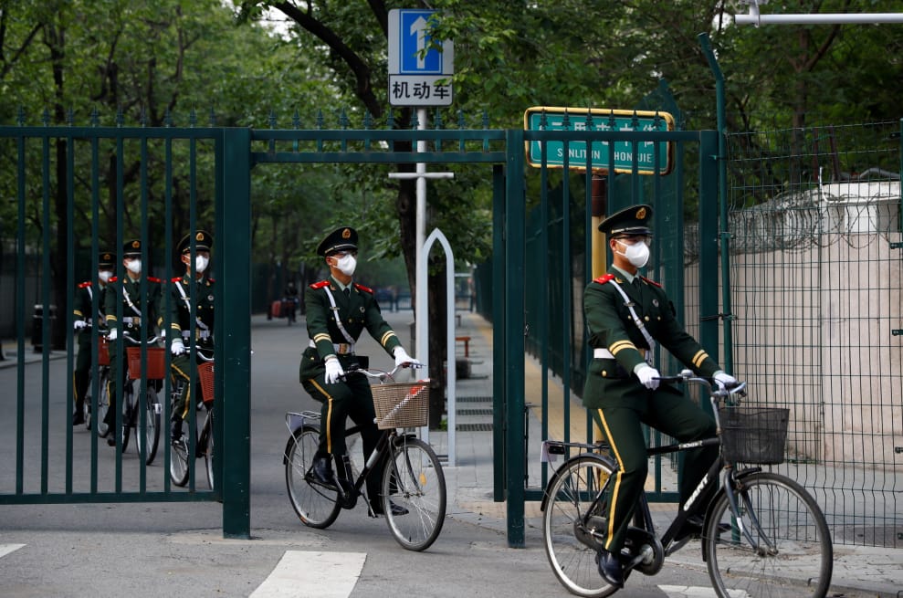 在北京,武警們戴著口罩、騎著單車經過一道鐵門。