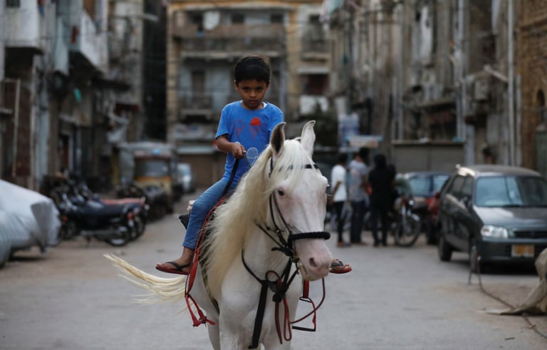 在喀拉蚩(Karachi),一名男孩騎著白馬出現在大街上。