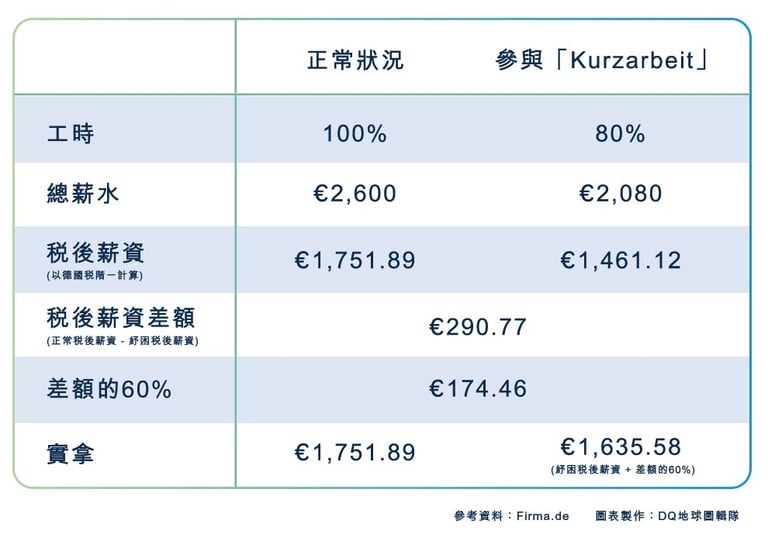 雖然在「Kurzarbeit」下,員工領不到全薪,但至少可以領到比沒參加紓困方案前還高的薪水。舉例來說,包柏(Bob)在這波疫情下,工作時間剩下八成: