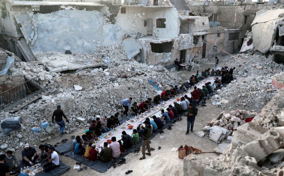 在阿勒坡(Aleppo)郊區,人們在被摧毀的社區中,享受由一隊志工準備的開齋飯(iftar)。