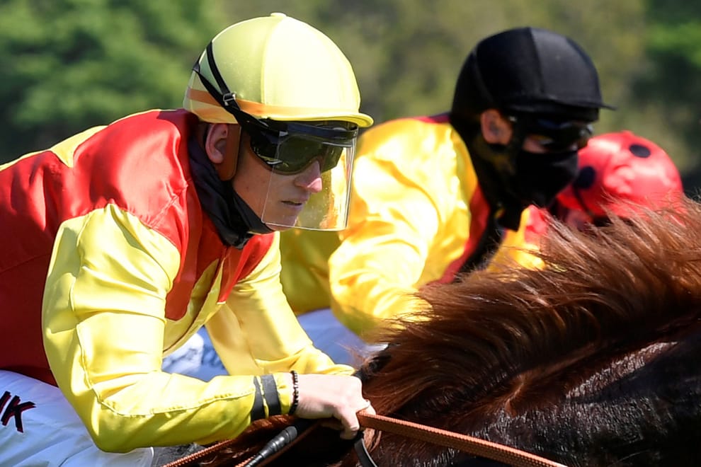在漢諾威(Hanover)舉辦了一場閉門賽馬,騎士米納里克(Filip Minarik,左)戴上防疫面罩,騎著他的馬卡德倫(Kadrun),迅速地奔向終點。