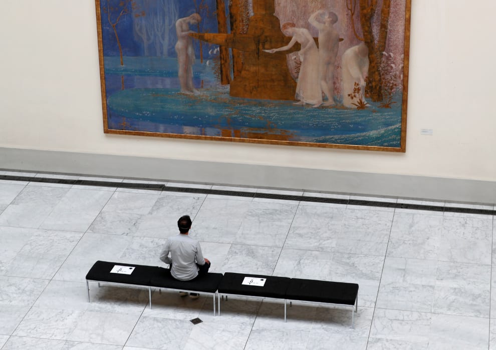 在布魯塞爾(Brussels),一名比利時皇家美術博物館(Royal Museums of Fine Arts)的員工在博物館重新開幕前,靜靜坐在一幅畫作前的長椅上。