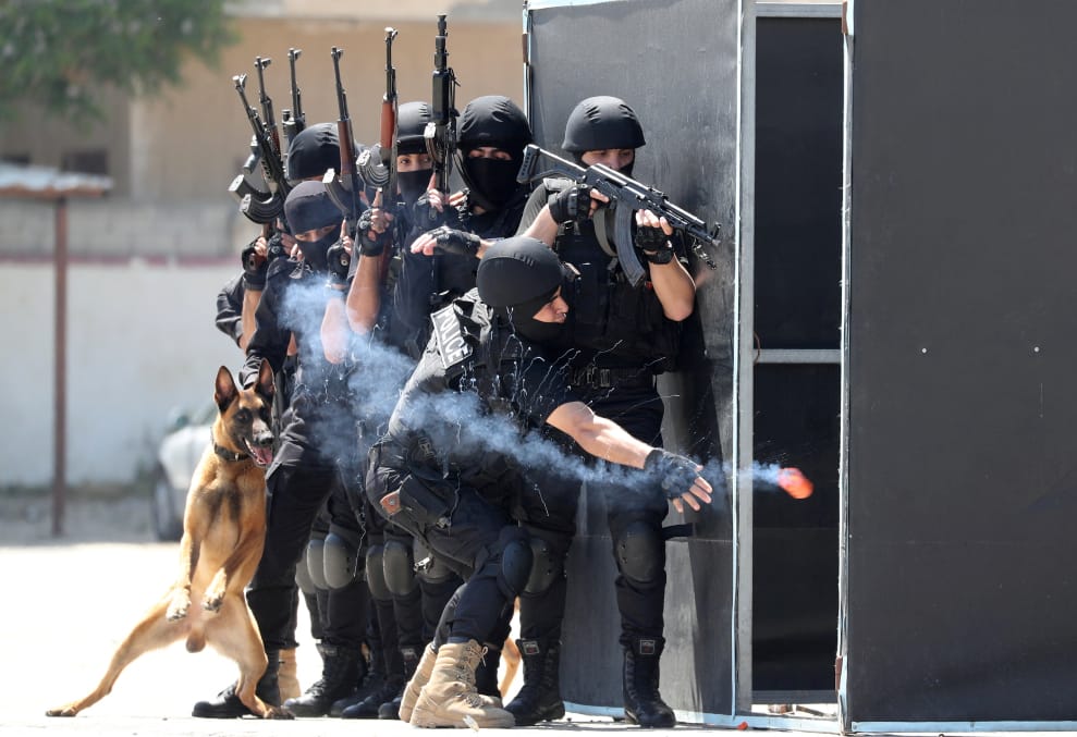 在加薩(Gaza City),一支由巴勒斯坦哈瑪斯警校學生所組成的小隊,正在畢業典禮上展示作戰技巧。