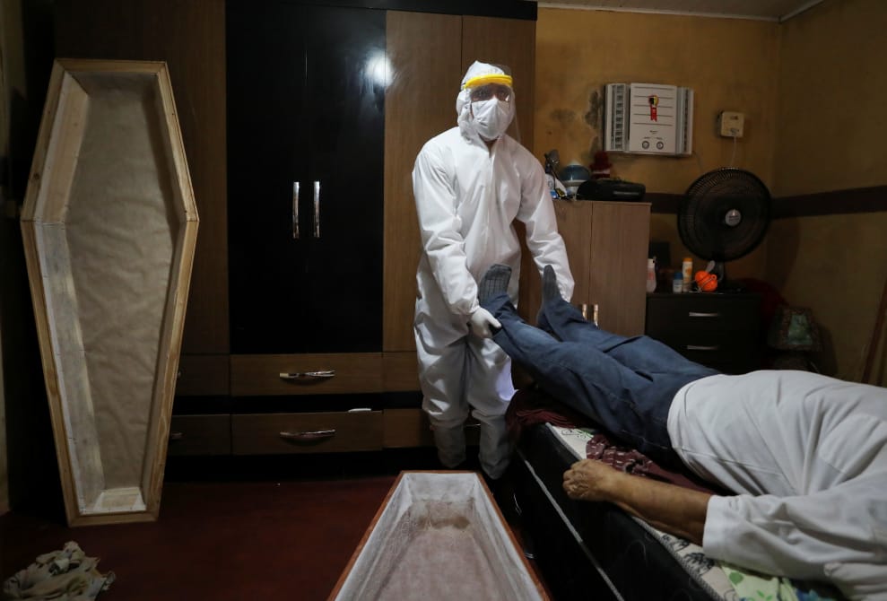 在瑪瑙斯(Manaus)的Tancredo Neves社區,一名葬禮SOS(Funeral SOS)的工作人員身穿防護服,正在搬移弗雷塔斯(Antonio Freitas)的遺體。