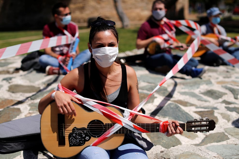 在塞薩洛尼基(Thessaloniki)的白塔(White Tower),音樂家們戴上口罩,用布條捆住彼此,要求政府給予援助,減輕COVID-19(武漢肺炎)對他們造成的經濟損失。
