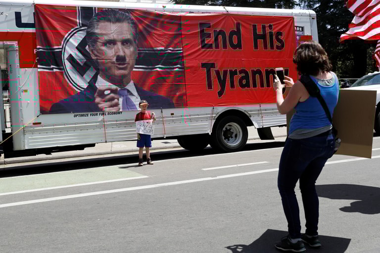 在加州的沙加緬度(Sacramento),一名小孩站在一面要求重啟加州、終結州長暴政統治的布條前拍照,希望加州可以盡快解除防疫封鎖令。