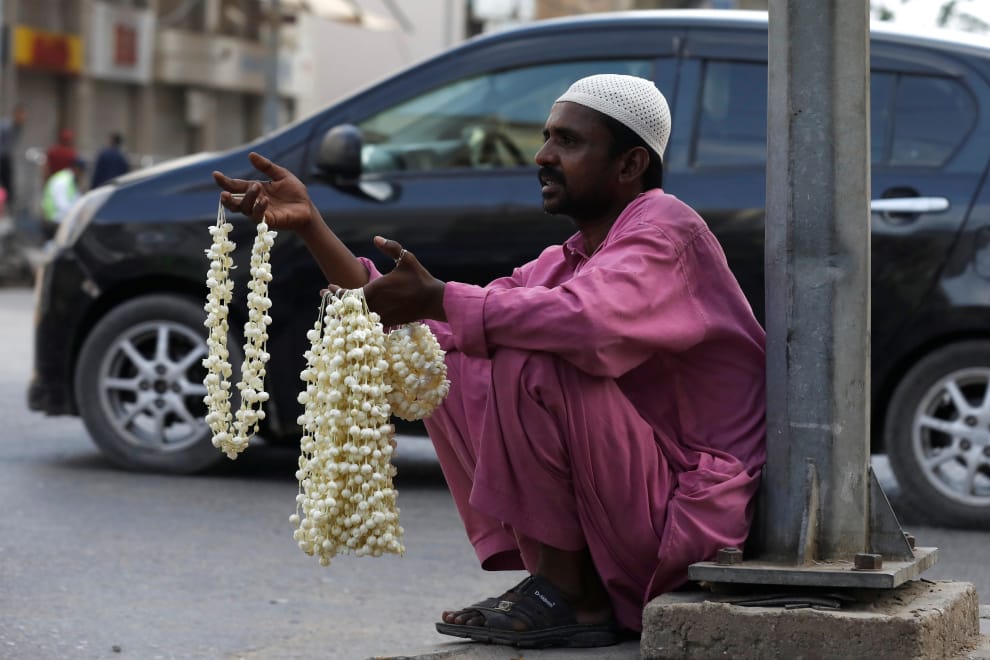 在喀拉蚩(Karachi),26歲的薩簡(Sajan)在車陣中販售茉莉花花環。
