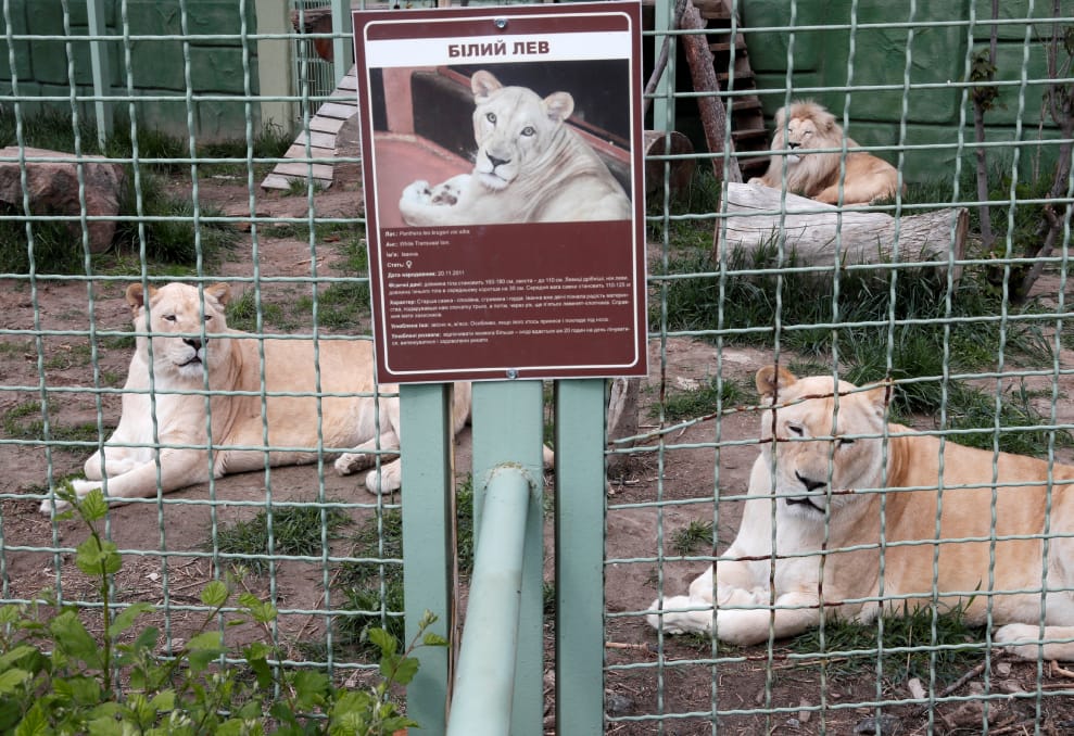 在德麥迪夫(Demydiv)一間名為「12月份」的私立動物園內,三隻白獅瞇著眼睛,看著攝影師的鏡頭。