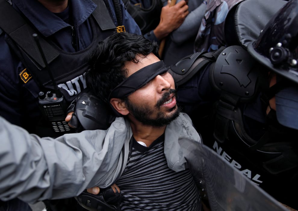 在加德滿都(Kathmandu),一名尼泊爾的學生因走上街頭,抗議印度在尼泊爾 47天的封鎖期當中侵犯尼泊爾西部邊境,遭到警方逮捕。