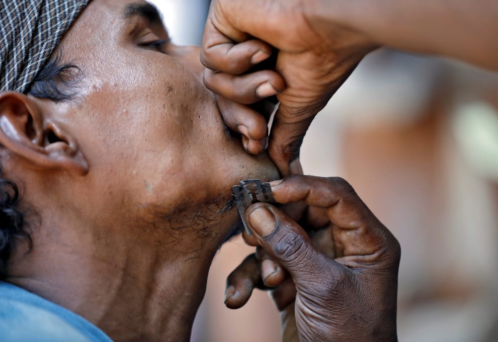 在艾哈邁達巴德(Ahmedabad),一名理髮師用刀片替一名外籍移工刮鬍子。