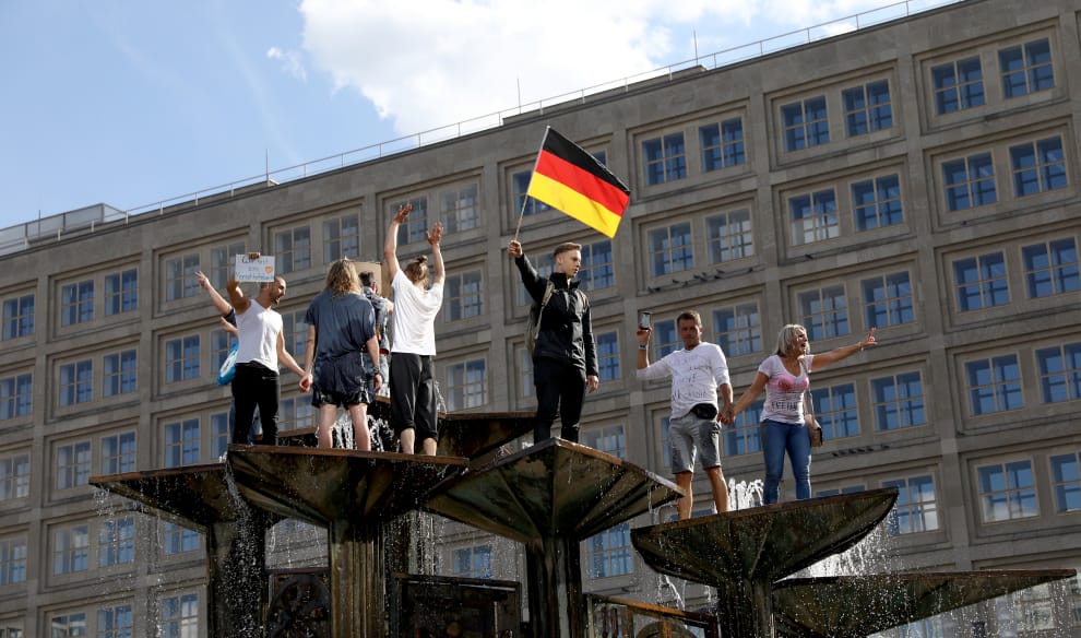 在柏林的亞歷山大廣場(Alexanderplatz),抗議群眾爬上高處揮舞德國國旗。