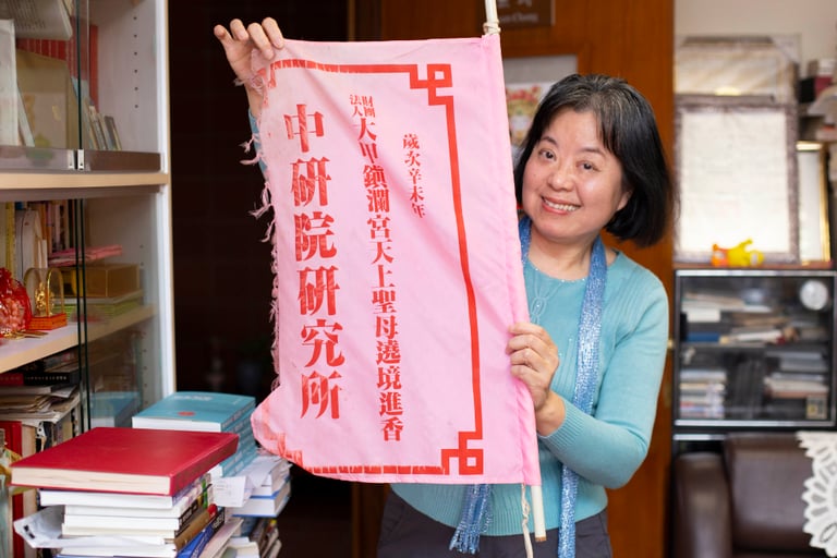 研究媽祖信仰多年,張珣曾參與大甲媽祖遶境 6 次,白沙屯 1 次,全程遶境也走過了 2、3 次。她拿出遶境時要帶的旗幟、臂章,上頭還印著大大的「中研院民族所」,她笑稱:「這代表我們真的辛苦地去田野!」
