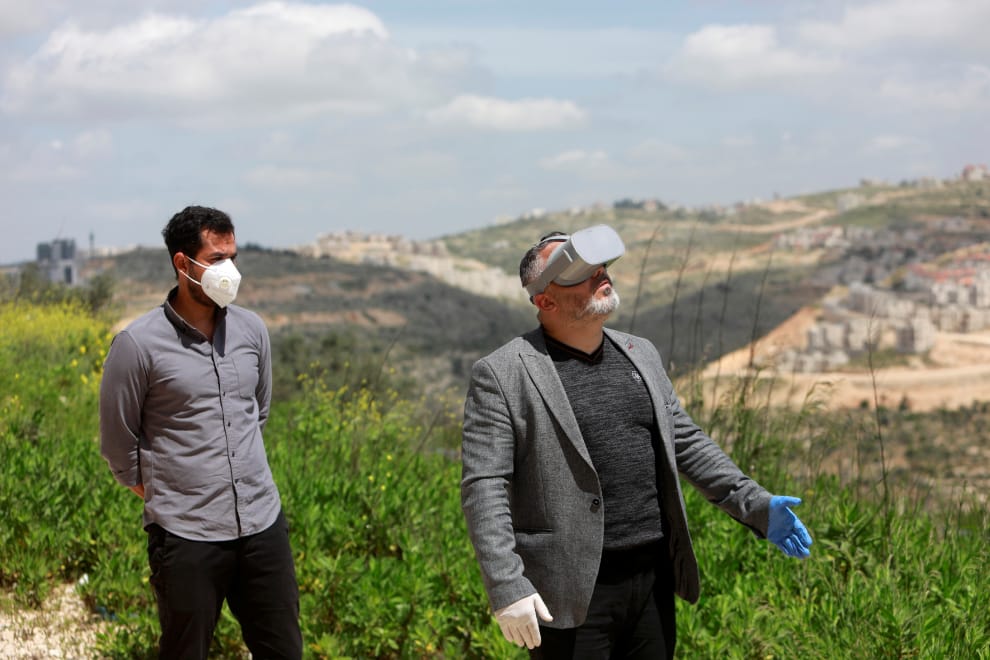 在約旦河西岸佔領區的拉馬拉(Ramallah),一名男子戴著一款虛擬實境(VR)裝置,體驗由巴拉美(Salem Barahmeh)開發,旨在為使用者導覽巴勒斯坦地區村莊的程式:巴勒斯坦虛擬實境(Palestine VR)。