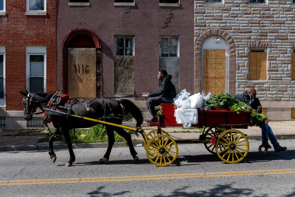 在馬里蘭州(Maryland),住在卡爾頓街馬廄(Carlton Street Stable)的康尼許(Todd Cornish)和錢尼(Daeshawna Chaney)替一匹馬凱蒂(Kitty)套上馬車,拉著牠出去將食物分送給西巴爾的摩(West Baltimore)地區的人們。
