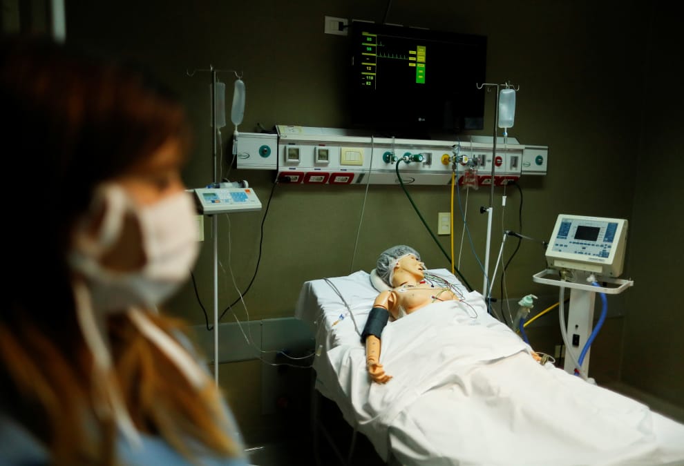 在布宜諾斯艾利斯郊外的弗洛倫西奧巴雷拉(Florencio Varela)的埃爾克魯斯醫院(El Cruce hospital),小兒科醫生勞爾(Norma Raul)在訓練過程中,經過一具假人旁。