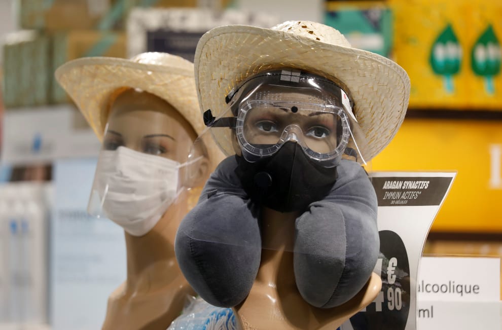 在魯瓦西(Roissy-en-France)的巴黎夏爾·戴高樂機場(Paris Charles de Gaulle airport),商店內的假人模特上展示著販賣中的口罩、面罩及護目鏡。