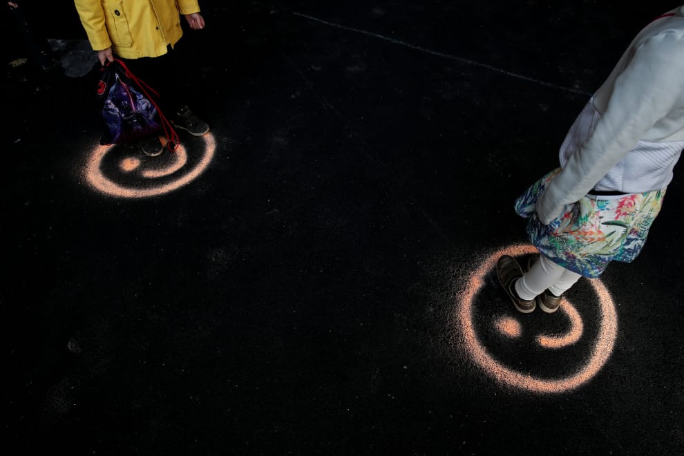 在巴黎(Paris),該市一小部分已經重新開放,部分巴黎小學生也在實施新措施及防疫政策,如:社交距離後,重新回到校園。兩名學童站在地上畫的笑臉當中,與彼此保持適當的社交距離。