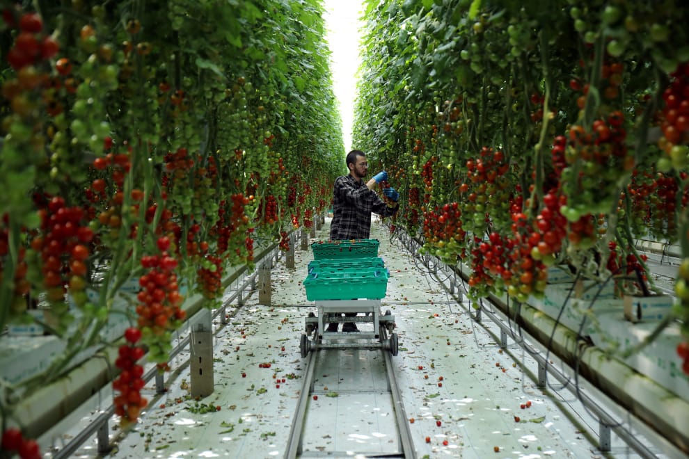 在英國中部的納茨福德(Knutsford),一名Frank Rudd and Sons番茄園的工作人員正在園中收採番茄。