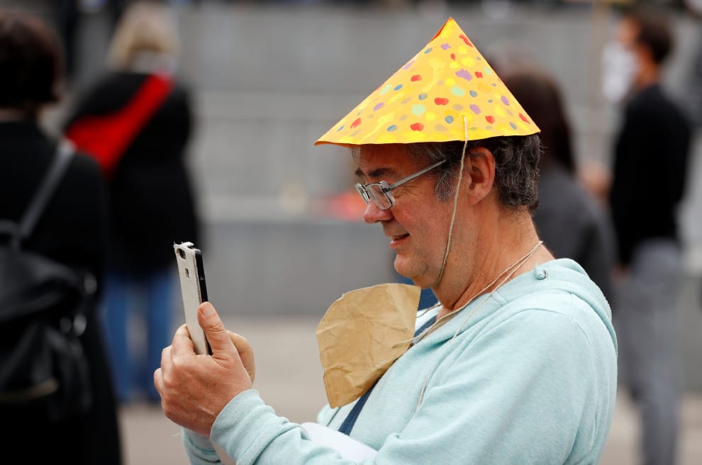 在維也納(Vienna),一名參與抗議政府防疫政策活動的男子,在示威過程中使用手機。