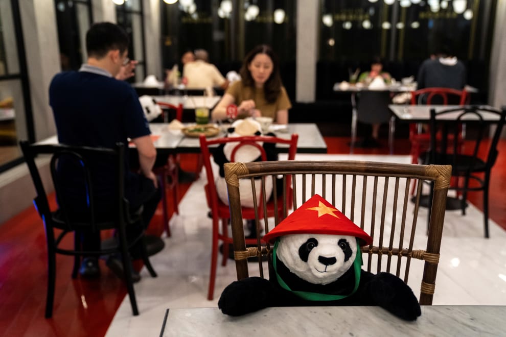 在曼谷(Bangkok)的Maison Saigon餐廳內,一隻貓熊娃娃佔據了一個位置,鄰桌則是一男一女正在用餐。