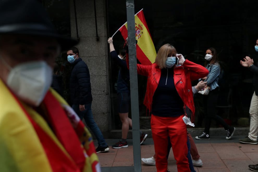 在馬德里(Madrid),示威人士戴上口罩於街頭抗議西班牙政府的防疫政策。