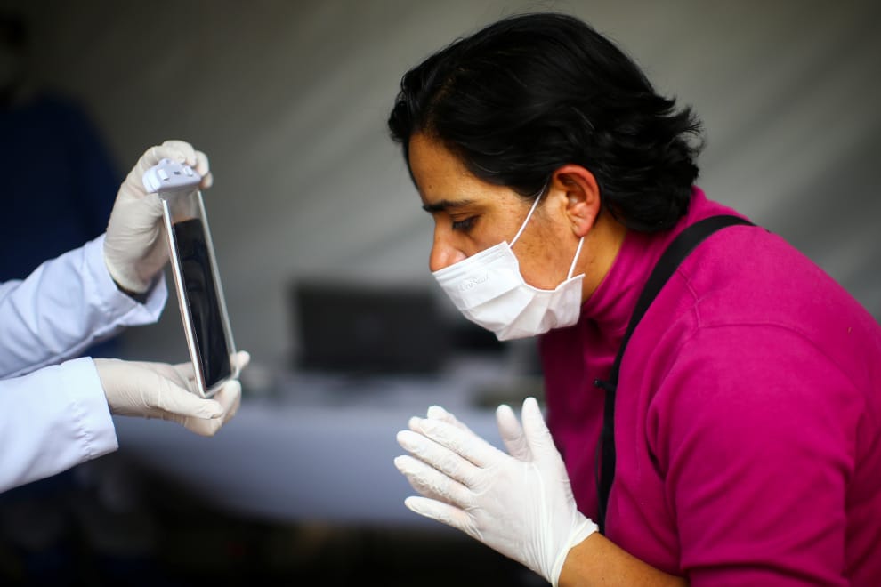 在墨西哥市(Mexico city),阿朱思科綜合醫院(Ajusco General Hospital)推出一項新政策,透過視訊電話的方式,讓病患的家屬能與病患說上話。照片中,寶琳娜(Paulina)正在與罹患COVID-19(武漢肺炎)的丈夫奧斯卡(Oscar)講話。