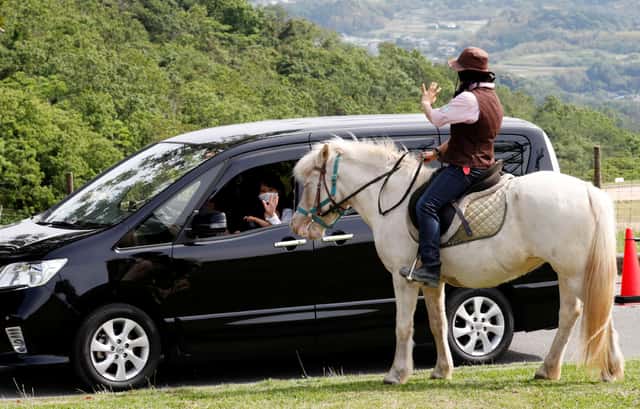 在日本千葉縣的富津市(Futtsu),母親農場(Mother Farm)最近開放了「得來速農場體驗」,一名工作人員騎著馬向車內的觀光客們揮手。