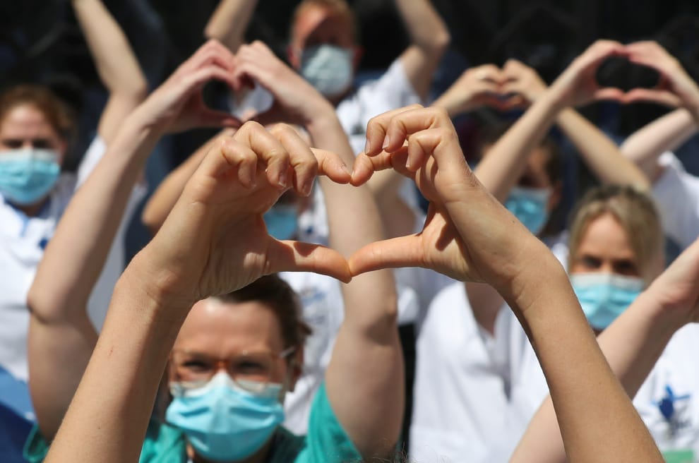 在列日市(Liege),MontLegia CHC醫院的醫護人員們組織起一場名為「保護醫護人員」的活動,戴上口罩,比出愛心的手勢,抗議比利時政府的防疫政策。