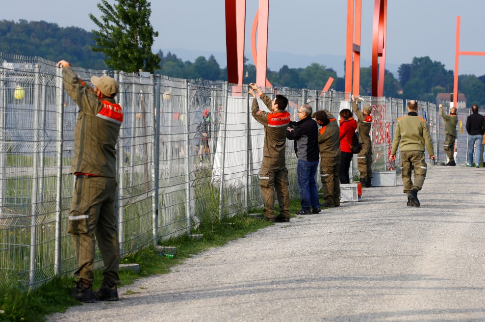在德國—瑞士邊境的小鎮克羅伊茨林根(Kreuzlingen),瑞士國民防衛隊(Swiss Civil Protection Service)的成員們正準備移除當初為了避免COVID-19(武漢肺炎)疫情擴散,兩國共同立起的圍欄。