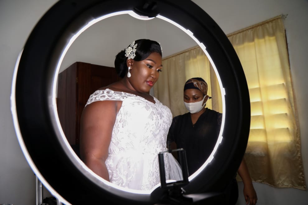 在象牙海岸第一大城阿必尚(Abidjan),戴著口罩的化妝師準備替 28歲的新娘奧夫莫(Marie Andrea Offoumou)化妝好參加婚禮。