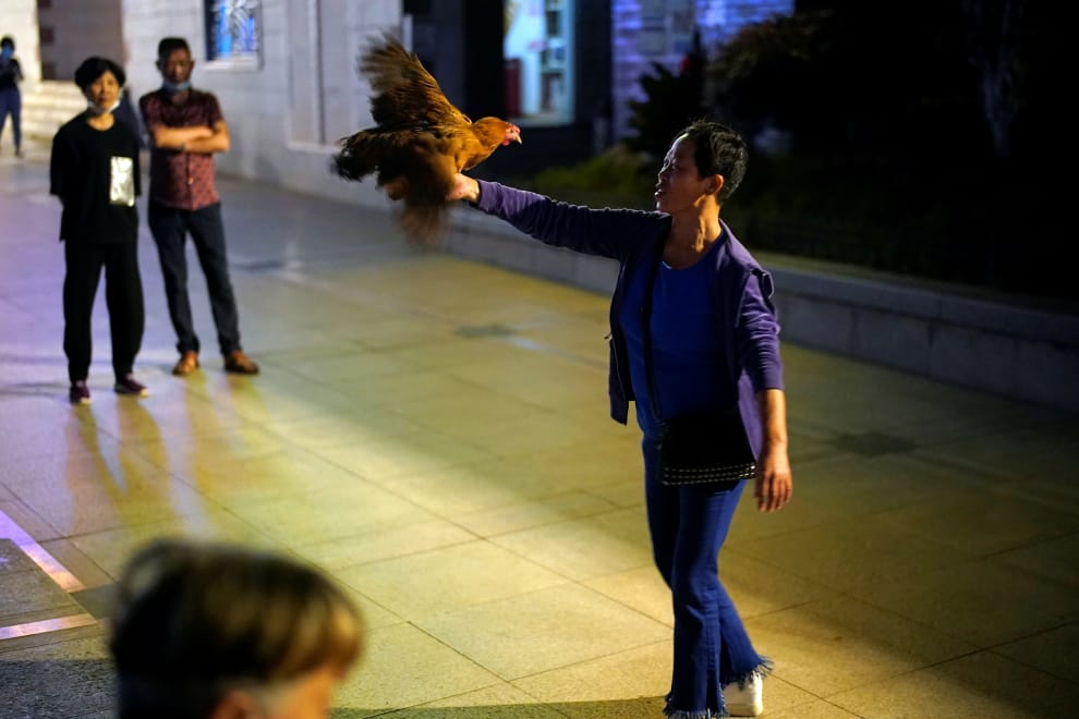 在武漢,陳茵(Chen Yin,暫譯)在公園內與她飼養的寵物雞共舞。