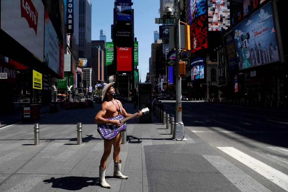 在紐約市的時代廣場(Time Square),裸體牛仔再度出現在街頭上。日前,百老匯劇院們紛紛宣布將延長暫停歇業期限,到疫情緩和後才會重新開幕。