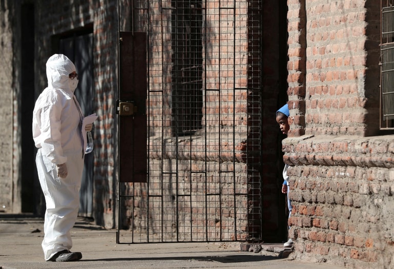 在首都聖地牙哥的移民社區,一名穿著隔離衣的女子正在和移民孩童說話。為了降低節節上升的COVID-19(武漢肺炎)確診率,智利當局開始在首都實施大規模隔離,希望能順利控制疫情。