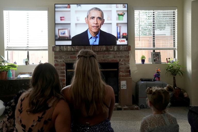 在加州聖地牙哥,今年畢業的高中生塞普(Phoebe Seip,中)的畢業典禮因為疫情的關係取消了,她只好待在家看美國前總統歐巴馬(Barack Obama)給今年高中畢業生的祝福演說。