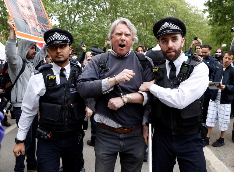 在倫敦海德公園,警方將抗議政府COVID-19(武漢肺炎)封鎖措施的民眾帶離現場。