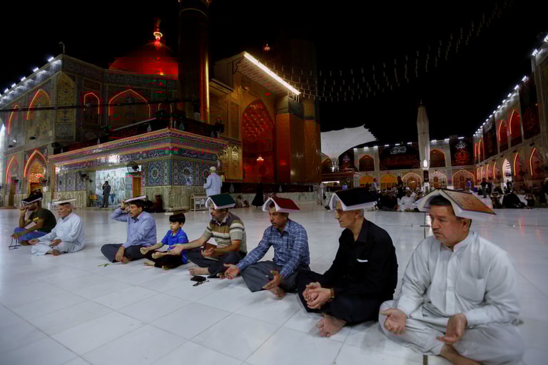 在伊斯蘭教什葉派聖城納傑夫市(Najaf),信徒們在齋戒月(Ramadan)期間,於伊瑪目阿里清真寺(Imam Ali Shrine)頭頂《可蘭經》禱告。