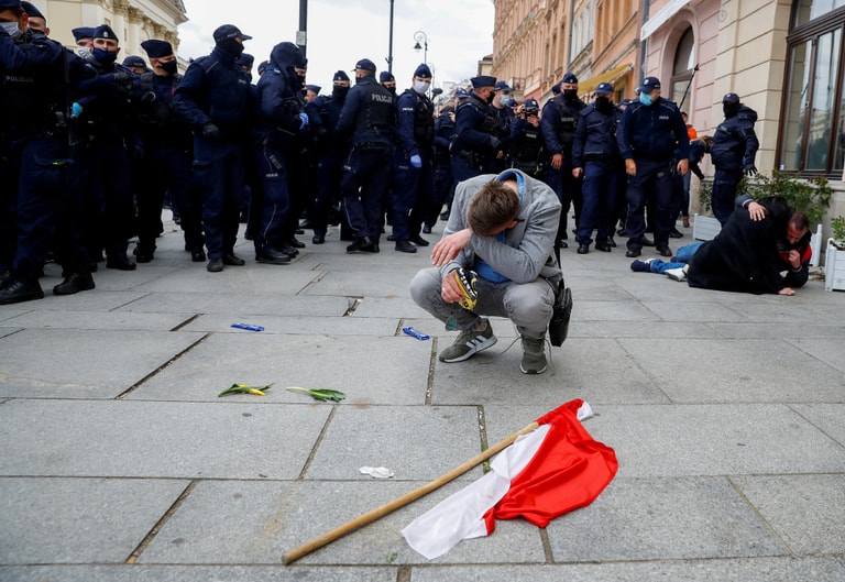 在首都華沙舉辦的一場反政府抗議活動上,一名被鎮暴警察噴了催淚瓦斯的男子痛苦地蹲在地上,他的身旁躺著一面波蘭國旗。16號這天,華沙老城區聚集上百名抗議民眾,他們呼籲政府盡快解除COVID-19(武漢肺炎)封鎖措施,讓各行各業可以正常營業。