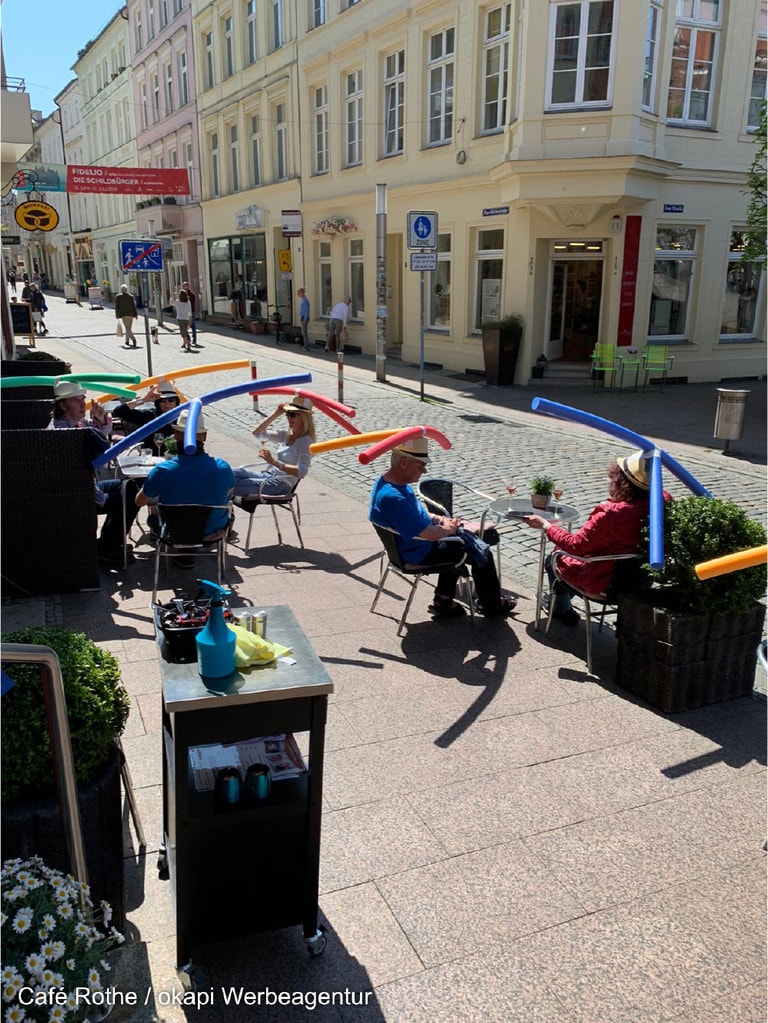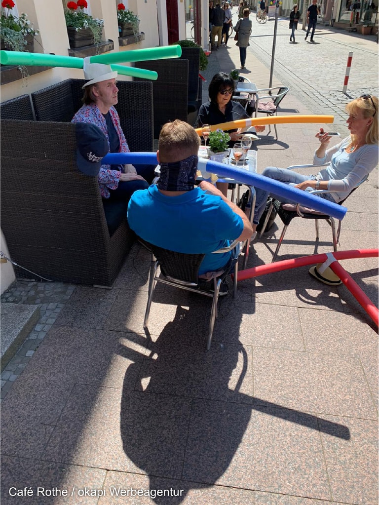 在餐廳重開幕這天,老闆羅特(Jaqueline Rothe)貼出一張戶外用餐區顧客戴著一頂頂浮條帽的照片,並寫道:「今天的餐廳:保持距離。」