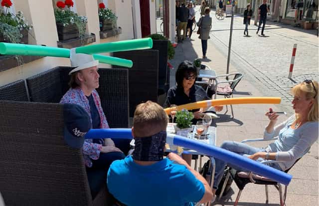 有別於大多數餐廳所使用的透明玻璃隔板,或是在地上畫滿保持社交距離的標示,羅特咖啡館決定請在戶外用餐的顧客們戴上「浮條帽」,確保彼此之間總是維持社交距離。