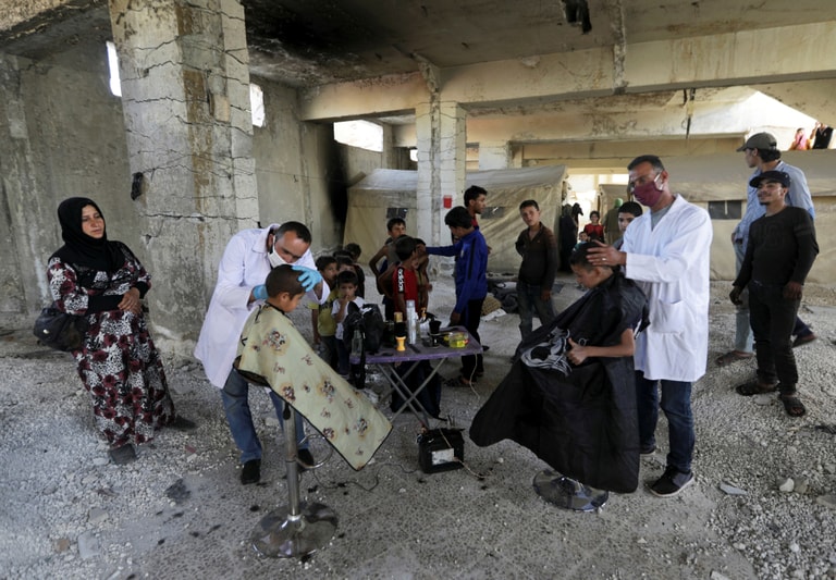 在位於西北部的伊德利卜省(Idlib),來自國際救濟與發展協會(International Association for Relief and Development,ONSUR)的志工戴上口罩和手套,替因為內戰流離失所的孩子們理髮,準備煥然一新地迎接開齋節的到來。