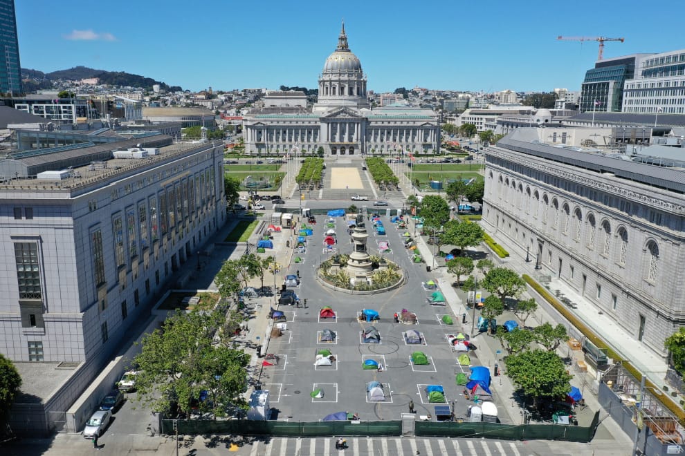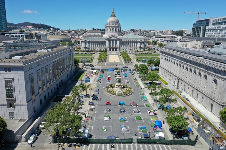 在加州舊金山市政廳旁的廣場,無家可歸的人搭起一座座帳篷,並且劃分出社交距離生活,這裡被當地稱為「安睡之村」(Safe Sleeping Village)。